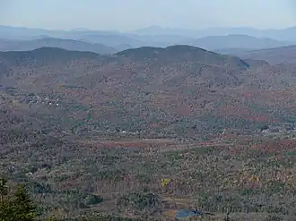 In his book, The History of the Town of Andover, John R. Eastman describes Ragged Mountain as a "truly ragged pile of ledge and boulder, crag and cliff, hill and ravine."[1] An east–west running, detached mountain, Ragged Mountain contains two prominent peaks separated by a shallow notch. The tallest peak, The Pinnacle, lies in the town of Andover at 2,286 feet (697 m); the second peak, at the top of Ragged Mountain Ski Resort, is 2,225 feet (678 m) and sits in the town of Danbury.