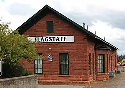 1889 Flagstaff's first train depot; in 1886, wooden depot destroyed by fire; present building made of Moencopi sandstone[5]