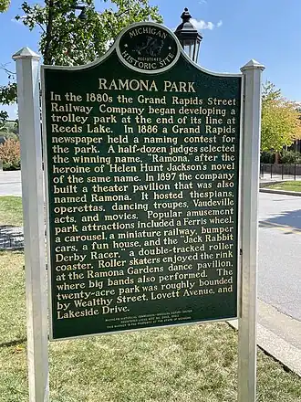 Ramona Park was located on the west shore of Reeds Lake in East Grand Rapids, Michigan, and owned and operated by the Grand Rapids Street Railway Company, a trolley park.[2] By 1921 the Ramona Amusement Corporation was formed and managed by the Railway Company. Trolley parks were common in the United States from the late 1800s into the mid twentieth century. Local transportation companies received fares for patrons riding the trolleys and also park admittance fees. A good example of a trolley park is Coney Island.