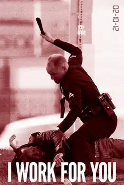 The marketing team behind Rampart posted controversial posters in several major U.S. cities before the film was released. They showed Harrelson's character, Officer Dave Brown, beating a man with a baton. The posters stated "I Work For You" and were meant to look like street art posters. Moverman said one of the producers had been "searching for an image that would be thought-provoking and challenging, not an indictment of a cop but rather a communal approach to the idea of policing, the idea that maybe when cops do bad things it's more of a reflection of society and what it is willing to tolerate, rather than the fault of one bad apple or an institutional problem. If they work for us, could it be they are us?"[12]