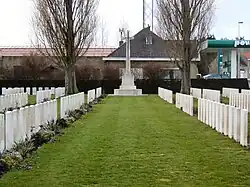 Currently, there are 841 Commonwealth casualties of World War I who are either buried or commemorated in Ramscappelle Road Military Cemetery. Of those, 312 are unidentified. Included in that number are 26 special memorials to those initially interred at Nieuport or Nieuport-Bains, and whose graves were destroyed in battle.[1] In addition to the above, 2 unidentified Foreign National burials are present, for a total of 843 graves in the cemetery. There are 529 identified casualties at Ramscappelle.[9] Among those interred in the cemetery are World War I British flying aces Lieutenant Lionel Ashfield and Captain Harold Mellings.[10][11][12][13]