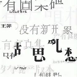 The album cover was unusual for its time: instead of any image of the singer's face, the main cover design shows overlapping phrases such as "no new images" and "no photo booklet" in Chinese characters of varying size, all of which have some strokes missing but allowing the phrase still to be discerned.[2][5] An alternative cover was all white except for the artist and album name, the latter in the same partial characters. The cover was the first to include the Mandarin name 王菲 (Wang Fei).[2]