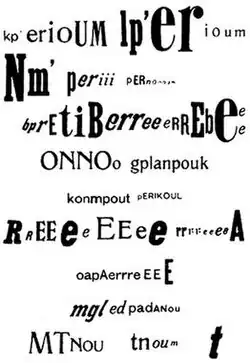 At the same time, Hausmann started to experiment with sound poems he called "phonemes"[12] and "poster poems", originally created by the chance lining up of letters by a printer without Hausmann's direct intervention.[13] Later poems used words which were reversed, chopped up and strung out, then either typed out using a full range of typographical strategies, or performed with boisterous exuberance. Schwitters' Ursonate was directly influenced by a performance of one of Hausmann's poems, "fmsbwtazdu", at an event in Prague in 1921.[14]