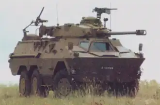 The Ratel is a South African infantry fighting vehicle. It was the first wheeled infantry fighting vehicle to enter service worldwide[10] and was built on a modified MAN truck chassis.[1] The Ratel was designed in response to a South African Army specification for a light armoured vehicle suited to the demands of rapid offensives, providing maximum firepower and strategic mobility to mechanised infantry units intended to operate across the vast distances of Southern Africa.[1] Primarily envisaged in SADF doctrine as a vehicle that could deliver mechanised infantry and supporting fire to tanks in conventional warfare, it was also anticipated that the Ratel could form the centrepiece for semi-independent battlegroups where logistics or politics precluded the use of tanks.[11] The Ratel was a simple, economical design which helped reduce the significant logistical commitment necessary to keep heavier combat vehicles operational in undeveloped regions.[1] It was generally regarded as an influential concept[3] which incorporated a number of novel features, such as a mine-protected hull, an extended operating range of 1,000 kilometres, and a 20 mm autocannon fitted with what was then a unique twin-linked ammunition feed, allowing turret gunners to rapidly swap between ammunition types during combat.[1]