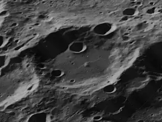 This crater has a worn outer rim, with a small crater along the northwestern rim and outward bulges to the north-northeast and east-southeast. The interior floor has a small crater in the western half and small craterlets along the western and southern edges. It is otherwise marked only by a few small craters.