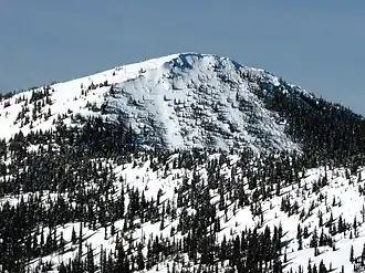 Record Mountain is the seventh-highest peak in the Rossland Range which is a subrange of the Monashee Mountains.[1] The peak is located six kilometres (3.7 mi) west-northwest of the community of Rossland and three kilometres (1.9 mi) west of the Red Mountain Ski Resort. Precipitation runoff from the peak drains into tributaries of the Columbia River. Topographic relief is modest as the summit rises over 1,400 metres (4,593 ft) above Big Sheep Creek in 4.5 kilometres (2.8 mi). The mountain's toponym was officially adopted on June 2, 1950, by the Geographical Names Board of Canada, although the name's origin/significance is not known.[5] However, the name was published as early as 1901, if not earlier.[4] One possible clue, Rossland's first newspaper, The Record also known as Rossland Record, was established in February 1895 by Eber C. Smith.[6][7]