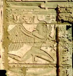 8. ^ Sonderzeichen U 103 gemäß Petra Vomberg: Sonderzeichenliste In: Rainer Hannig: Großes Handwörterbuch Ägyptisch-Deutsch : (2800 - 950 v. Chr.). von Zabern, Mainz 2006, ISBN 3-8053-1771-9, S. 1448.