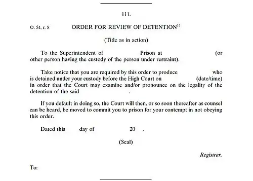 - ^ Jeffrey Pinsler, ed. (2005), "Order 54: Application for Writ of Habeas Corpus", Singapore Court Practice 2005, Singapore: LexisNexis, pp. 1142–1144 at 1144, para. 54/1-9/2, ISBN 978-981-236-441-8.