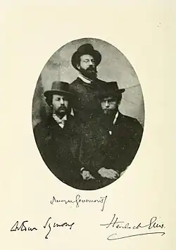 Gourmont also began a literary alliance with Joris-Karl Huysmans, to whom he dedicated his prose work Le Latin mystique (Mystical Latin). In 1889 Gourmont became one of the founders of the Mercure de France, which became a rallying point of the Symbolist movement.[3] Between 1893 and 1894 he was the co-editor, along with Alfred Jarry, of L'Ymagier, a magazine dedicated to symbolist wood carvings. In 1891 he published a polemic called Le Joujou Patriotisme (Patriotism, a toy) in which he argued that France and Germany shared an aesthetic culture and urged a rapprochement between the two countries, contrary to the wishes of nationalists in the French government. This political essay led to his losing his job at the Bibliothèque Nationale,[4] despite Octave Mirbeau's chronicles.