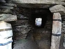 The earth house is located in a farmyard near the southeastern shore of the Bay o' Firth, on the Mainland of Orkney, in Scotland. Access to the underground monument is by ladder to a hatch in the roof.[1] The souterrain has an entrance passage which is 3.5 m (11 ft) long with a drop of around 0.7 m (2 ft 4 in) to the floor of the chamber. The chamber is hexagonal in shape and measures 3.3 m (11 ft), and is 2.5 m (8 ft 2 in) in width. The walls were built with a combination of slabs laid on edge and rough masonry. The 1.5 m (4 ft 11 in) corbelled roof is supported by four stone pillars. The walls are lined with five small alcoves.[2][3]
