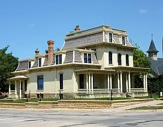 The Hubbard House's location on South Broad Street was once part of Mankato's "silk stocking district", which included a number of Victorian era mansions. Built on a basement of cut stone, the structure used brick and wood with Mankato stone trim details.[5][8] The home was built in two sections: The original section of the main house, built in 1871, is two and a half stories with a mansard roof of colored slate.[5] The 1888 addition is one and a half stories and is telescoped in the Italianate style. The structure features a front porch with Ionic columns.[8]