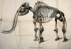 American painter Charles Willson Peale worked with Mammut fossils as early as 1783 when he was commissioned by the German physician Christian Friedrich Michaelis to draw the mammutid fossils in the collection belonging to American physician John Morgan.[30] He also opened his own Philadelphia Museum in 1786, but it was not until the 19th century that it became significant to the paleontological history of Mammut. In June 1801, he visited Newburgh, New York to view skeletal remains found on a farm belonging to John Masten.[31] The skeletal remains began to be uncovered as early as 1799 when workers found an approximately 18 in (460 mm) long thighbone while digging a marl pit at the farm locality. A crowd of about one hundred people gathered to view the skeletal discoveries, including local physician and later fossil locality supervisor James G. Graham. Although many of the specimens were broken in the process, they were part of the first known complete skeleton of Mammut. Initially, Masten refused to sell the fossils in order to wait for all skeletal remains to be dug up.[32]