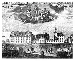 Landgrave Ernst Ludwig commissioned the French architect Louis Remy de la Fosse to plan a new baroque palace with four large wings in 1715, after the palace's chancellery had burned down.[7] This was to completely replace the old palace. Due to lack of money, however, only two wings were completed by 1726. These were to remain the last major structural changes to the castle. When Hessen-Darmstadt joined the Confederation of the Rhine in 1806, the castle became the seat of the Grand Dukes of Darmstadt.[19] At the beginning of the 19th century, the upper floors of the new castle were furnished and fitted with window glazing.[11] In 1842, the university and state library and the grand ducal collection with natural history cabinet moved in.[11] Since the 18th century the castle has been less and less inhabited by the grand dukes and other members of the ruling family who settled in more comfortable premises, most of which were destroyed in World War II. These included the Altes Palais and Alexanderpalais on Luisenplatz, the Neues Palais and Prinz-Carl-Palais to the south, the Prinz-Georg-Palais to the north, and the Palais Rosenhöhe near the family's burial grounds in the Rosenhöhe Park to the east. Meanwhile, more and more institutions were admitted into the vacant old residential palace, and some of the rooms were reserved for state guests.[11][7][16][15]
