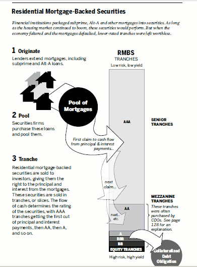 While private-label subprime mortgages would never be able to make that claim, by "slicing" the pooled mortgages into "tranches", each having a different priority in the stream of monthly or quarterly principal and interest stream,[23][24] they could create triple A rated securities from the tranches with the highest priority — the most "senior" tranches.