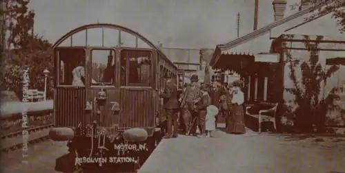 ![]() Resolven station circa summer 1905, with passengers boarding one of the then-new GWR steam railcars | |||||