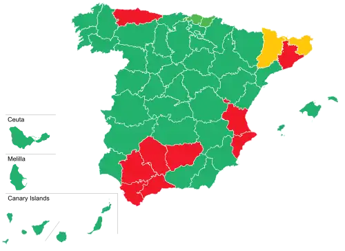 - ^ This territorial division is based on the autonomic system established under the Spanish Constitution of 1978, as opposed to the regional division established in 1833. Most autonomous communities would be constituted by the time of the 1982 election, with the rest being established in early 1983. The autonomous cities of Ceuta and Melilla would not be constituted as independent administrative entities until 1995.