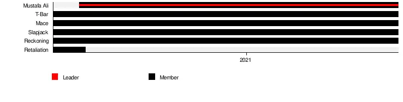 On the September 21 episode of Raw, the core members were revealed as Dominik Dijakovic (T-Bar), Dio Maddin (Mace), Shane Thorne (Slapjack), Mercedes Martinez (Retaliation), and Mia Yim (Reckoning). That night, T-Bar, Mace, and Slapjack made their in-ring debut against The Hurt Business (Bobby Lashley, Shelton Benjamin, and Cedric Alexander), losing via disqualification.[6][7][8] On the October 5 episode of Raw, Mustafa Ali was revealed as the group's leader.[9] Shortly afterward, Martinez quietly departed the stable and returned to NXT.[10][11]