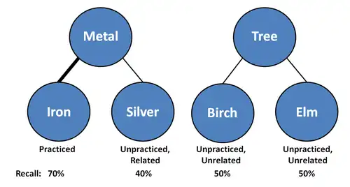 Although the typical paradigm includes retrieval practice of previously studied words, some studies have shown RIF even when participants were asked to retrieve something else. For instance, RIF has occurred even when participants generated new, unstudied items from previously studied categories in what is called "extra-list retrieval practice" or "semantic generation."[17][32] In a method called "impossible retrieval practice," RIF has also been observed when participants were asked to generate a word for a category, even though one did not actually exist.[32][33] RIF is still observed at final test in cases where successful retrieval is not possible, such as one where having studied a number of fruits a participant is asked to generate a word given a cue resembling FRUIT–wu.[32] Some studies have also examined the effect on RIF when participants, instead of being asked to perform retrieval practice, are given additional study trials making them restudy the material instead of remembering prior information. In these cases, participants have failed to show any RIF effects.[12][25]