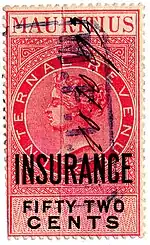The first insurance stamps of Mauritius were issued on 1 March 1869. They were Queen Victoria postage stamps handstamped INCE in black. From later that year to 1879, all insurance stamps were internal revenue stamps handstamped or overprinted INCE, sometimes the stamps were also surcharged. In 1879 a new set of internal revenue stamps but in new colours was overprinted INSURANCE in black. In 1904 a new type appeared, similar to the design used for high value postage stamps, but with a blank value tablet and in purple. These were then overprinted INSURANCE ONLY and the value. Three different formats exist.[1]