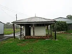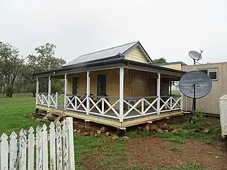 The accommodation for the two to four police Aboriginal trackers employed on Rewan between 1909 and 1934 was inferior to that provided for other staff. An image from c. 1909–17 of one residence shows a dirt-floored, slab-walled and bark-roofed hut, with boughs and rocks used to hold the roof in place.[41][42] Their accommodation in 1920 was described as "big, comfortable and waterproof huts".[43] The trackers on Rewan are known to have undertaken horse- and cattle-related duties, and fence- and yard-building. Elsewhere in Queensland, trackers performed kitchen duties, cared for horses, checked fences and looked for trespassing stock.[44][45] By early 1911, a second dwelling had been constructed southeast of the sergeant's quarters, to accommodate the Commissioner of Police and other government officials when they inspected the property. Initially it was called the commissioner's cottage, but was later referred to as the officers' quarters. This timber-framed and -clad building with verandahs to its north and west elevations, had a corrugated metal roof with acroteria, and post-and-rail verandah balustrades.[38][46][47] As it was intended for periodic short-term use by official visitors, it comprised only two bedrooms and a bathroom. By the end of April 1911, the sergeant's quarters and the commissioner's cottage, along with well-tended gardens to the front, had been fenced in with 124 feet (38 m) of painted picket fence, including two wicket gates and two large double gates, at the front and the back of the buildings; as well as 369 feet (112 m) of split paling fence.[48][1]