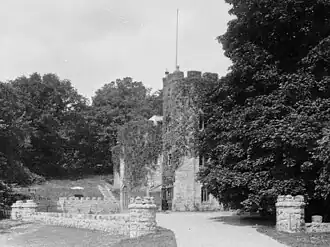 The 19th-century Rhiwlas Hall was a large building constructed in 1809. RCAHMW describes it as being "three-storeyed and castellated with turrets",[6] while Cadw considers it to have been an "enormous rambling mansion".[7] The architect is unknown. Thomas Rickman undertook some work on the estate at the time of the reconstruction, including the entrance gate,[8] but Pevsner does not ascribe the house to him.[3] The hall was demolished in 1954, having suffered both wartime requisition and dry rot. The replacement, designed by Clough Williams-Ellis, is considered by Richard Haslam, Julian Orbach and Adam Voelcker, writing in their 2009 volume Gwynedd in the Pevsner Buildings of Wales series, to be among his best work.[3]