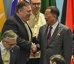 In August 2017, amid heightened tensions on the Korean Peninsula, Ri took part in a rare multilateral meeting with foreign ministers at a summit meeting in Manila, Philippines. Ri negotiated with his South Korean, Chinese, and Russian counterparts, making the meeting only two parties – the United States and Japan – short of the makeup of the six-party talks.[21] On 7 August, Ri said that his country will never negotiate away North Korea's nuclear weapons.[22]