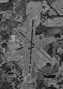 The airport covers an area of 985 acres (399 ha) at an elevation of 644 feet (196 m) above mean sea level. It has two asphalt paved runways: 1/19 measures 6,006 by 150 feet (1,831 x 46 m) and 7/25 is 4,497 by 100 feet (1,371 x 30 m).[1] A former third runway which was designated 14/32 is closed.