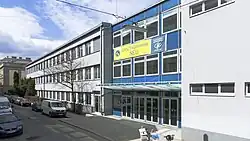 After becoming an independent architect in 1958, Gach actively contributed to the construction of Viennese housing and schools.[2] The Gach-designed Gangschule with 24 classes and two high schools comes from the "haze circle" of Hubatsch's school concepts.[6] This concept is typified by the residential complex Edergasse 1-3 in Vienna 21 and the two high schools Hernalser Gymnasium Geblergasse and Amerling-Gymnasium. In 1970, the former Esterhazypalais (Palais Kaunitz) was demolished for the construction of the Amerling Gymnasium. Built in 1970-1972, the new building with 24 classrooms and two sports halls corresponds to the common typology used in the construction of secondary schools in the late sixties, without any architectural respect for the environment.[7]