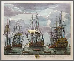 Exact Stern View of the 'Glorioso', a Spanish Man of War, taken by HMS 'Russel', In the middle the 'Jason', on the left the Gloire, two of the six French ships taken May 1747, 1755