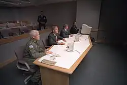 Richard Mies, President George Bush and White House Chief of Staff Andrew Card participate in a video teleconference from Offutt Air Force Base in Nebraska on September 11, 2001.