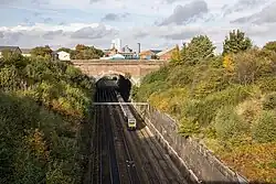The current 'tunnel' area of Richmond Hill is listed as being 118 yards (108 m), (or 5 chains (330 ft; 100 m)), with five lines running through the tunnel and Marsh Lane Cutting, which was part of the tunnel before it was opened out. Four of the lines are electrified, and the fifth is a goods loop to a stone terminal on the original site of Marsh Lane terminus.[41][42] The lines through the tunnel and cutting were electrified at 25kV in 1989, as part of the East Coast Main Line electrification scheme, and allow for empty stock transfers between Leeds railway station, and the depot at Neville Hill.[43][44] Besides allowing trains access and egress from the depot at Neville Hill, the line is an important passenger line for TransPennine Express trains.[45]
