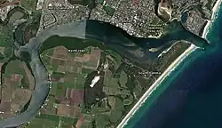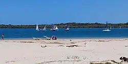 Near its entrance to the Pacific Ocean, the sheltered estuary of the river provides several sandy beaches and opportunities for recreational activities including swimming, sun bathing, yachting, fishing and dog walking.[9] It is also home to the Richmond River Sailing & Rowing Club,[10] and provides access to the Ballina trawler harbour which is situated just off the river estuary, where the river is joined by Fishery Creek.[11] One small area of residential canal estate development, the Ballina Quays, extends the available river frontage for housing so that each can then have individual moorings as desired, set back from the remainder of the river frontage.[12]