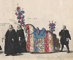 A riderless horse is a single horse without a rider and with boots reversed in the stirrups, which sometimes accompanies a funeral procession. The horse, sometimes caparisoned in black, follows the caisson carrying the casket.[1] A riderless horse can also be featured in parades (military, police or civilian) to symbolize either deceased soldiers, police officers or equestrian athletes.[2] A motorcycle can be used as a substitute for a horse though such practice is very rare back then but now common.[3][4]
