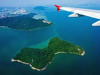 Rimau Island is the second island from the left (the first being Kendi Island) in this panorama from the Second Penang Bridge