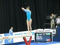 ![]() Riselda Selaj on beam during European Championship in Birmingham 2010 | |