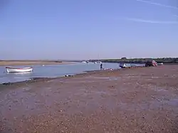 From here the river enters Overy marshes and Overy Creek. The river spreads out into multiple tidal creeks through the salt marshes that fringe the coast thereabouts, and finally leaves land and enters the sea between the eastern point of Scolt Head Island and Overy Marshes, the gap locally known as Burnham Harbour. Small boats can reach Burnham Overy Staithe through this gap and creek.