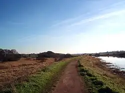 From Castle Park to Wivenhoe Railway Station, National Cycle Network Route 51 roughly follows the course of the Colne. This is a mixture of tarmac-surfaced shared-use paths, a short tarmac/gravel-surfaced area and, once out of the urban area of Colchester, a hard dirt path on the north levee of the river that passes the Hythe and the university all the way to Wivenhoe.