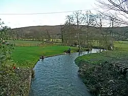 To the south of Walcot Park, it is crossed by the Shropshire Way and then passes through the village of Kempton, where there is a ford and footbridge. The river continues due south, until it reaches the Clun valley near Clunbury. It joins the larger river to the east of the village at Oaker near Aston on Clun.[1]