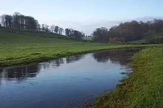 The river runs behind Lodge Park, a National Trust property, and through Larkethill Wood, where it flows under another lane, before passing Kilkenny Farm.[3] The Leach valley shows as a substantial dip in the B4425 Cirencester-Burford road. The river has an embankment at the bottom of the valley, but has not increased in size. Through all this section the river is often nearly invisible under summer vegetation. It then passes Swyre Farm with another road crossing, then Dean Farm, before reaching a very picturesque winding valley, crossed by the Westwell-Hatherop road.[4] This section is notably a bourn in an unremarkable depression, that is, it normally runs in the winter, but often below the surface or dry in part of the summer. The bourn section is usually running continuously long enough to have the appearance of a river, with a scoured bed and water plants.)