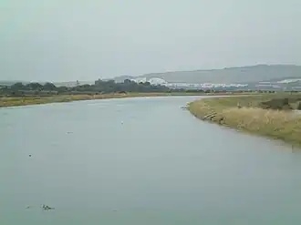 At Southease there is a swing bridge, designed by Henry E Wallis of Westminster in 1878 and installed two years later, to replace a previous structure slightly further upstream. It consists of three bowspring arches, one fixed and the other two mounted on a central pivot. It was manually operated by a capstan mounted on the movable section, and is a rare example of its type, which are more normally found in docks and industrial areas. In 1988, Parliamentary approval was obtained to fix the bridge in position,[15] as it had not been opened since 1967.[16] The river finally reaches Newhaven, where it splits industrial Denton Island from the mainland. A wooden drawbridge was built in 1794 to carry the coastal road over the river, but this was replaced in 1866, when a cast iron swing bridge was erected in its place. It carried both a road and a tramway, which was used in the construction of the West Quay breakwater, a project which was finally completed in 1889. The tramway was then used to facilitate maintenance of the breakwater, until the tracks were lifted in 1963. A new road bridge, at a higher level and slightly further to the north, replaced the swing bridge in 1974.[16] It is opened regularly for commercial shipping, near to high tide, but as the bridge carries the A259 road, each opening causes significant traffic congestion.[17] Below the bridge, the river becomes the Port of Newhaven, where there is a ferry terminal for sailings to Dieppe in France, a service which has been running since 1847.[18] Finally, the river flows into the English Channel, surrounded on either side by two long breakwater piers.[5]