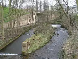The Sett passes under the A624 Hayfield "bypass". The tower of St. Matthew's church can be seen through the trees in the background, and in the foreground are the scanty remains of Walk Mill.