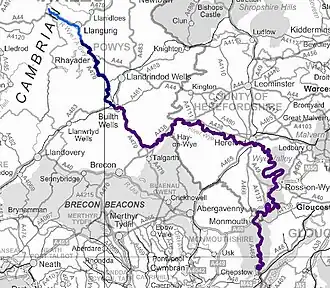 The River Wye (/w/; Welsh: Afon Gwy [ɡʊɨ̯]) is the fourth-longest river in the UK, stretching some 250 kilometres (155 miles) from its source on Plynlimon in mid Wales to the Severn Estuary.[1] The lower reaches of the river forms part of the border between England and Wales. The Wye Valley (lower part) is designated a National Landscape (formerly an Area of Outstanding Natural Beauty).[2][3] The Wye is important for nature conservation and recreation, but is affected by pollution.[4][5]