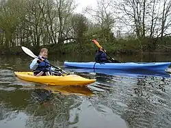 The River Wye provides for canoeing and kayaking as it has sections suitable for all ranges of skills and free access all the way downstream from Hay to Hereford and Monmouth, and the tidal Wye to Chepstow and the Severn Estuary.[51] There are a wide range of canoe hire and supervised trips, as well as campsites at key points on the river. Symonds Yat has a particularly popular series of rapids that was purchased by the British Canoe Union in 2003 to preserve the rapids for recreational use, canoe trips through the rapids stop next at Monmouth.[52] There are three rowing clubs on the river at Hereford, Ross-on-Wye and Monmouth. Annual regattas are held at Ross-on-Wye and Monmouth for rowers and scullers of all abilities, next to the local rowing club. In 2017 more than 600 people took to the River Wye in inflatables ranging from dinghies to paddling pools during the event WYE FLOAT, opened by former Olympic ski jumper Eddie the Eagle.[53]