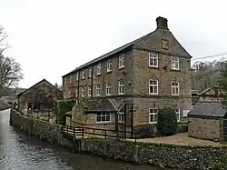 A second marble mill was built by George Redfern of Ashford-in-the-Water around 1846. It was known as Batch Mill or the Derbyshire Marble Works. A new weir was constructed in the river, at right angles to an existing weir which fed water to Ashford Corn Mill. A covered leat delivered water to the mill, which was housed in old farm buildings behind Great Batch Hall. The water wheel was replaced by a turbine around 1860, and production ceased before 1890.[39] Ashford Corn Mill is a "L"-shaped building, dating from the 18th century, with additions made in the 19th and 20th centuries. It is also known as Flewitt's Corn Mill, and the complex includes a drying kiln. It was originally powered by two undershot water wheels, one made of iron and the other of wood. These were removed around 1900, and replaced by a single turbine, manufactured by Gilkes of Kendal. This drove three sets of stones, of which two remain, as they were replaced by rollers. The mill continued operating commercially until the 1970s, making it one of the last in the country to use water power. It is in good condition, with most of the machinery and the kiln still intact.[40] A two-year project to refurbish the building was competed in 2017, and won the Peak District National Park Planning Award for Conservation in 2018.[41] The mill has featured on Channel 4 TV's [[[George Clarke (architect)#Television|Remarkable Renovations]] programme, and on the BBC's Countryfile. The building is rented out as holiday accommodation. As part of the renovation, the water turbine was refurbished, enabling the mill to be self-sufficient for electrical power.[42]