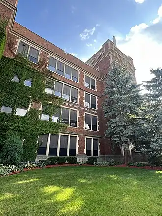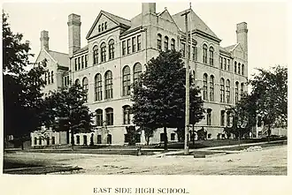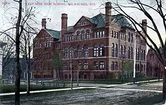 Starting in the early 1850s the newly established city of Milwaukee debated establishing a public high school. As early as 1860, Milwaukee had a high school program in the attic of an elementary school in the Brady St. area. The school was at a Jefferson St. location in its founding year of 1868.[2] After several fires and increasing enrollment, East Division High School, also known as East Side High School, opened in the late 1880s. By 1906 ground was broken for a state-of-the-art building at 1615 E. Locust St. (East Locust Street was known at the time as Folsom Place.) Using then modern technology, the architect increased the window size by using a steel frame designed to bear the weight of the building. This also allowed for less restrictive and cheaper construction. This new design attracted local residents as well as residents in surrounding areas. The design was that of a four-story U-shaped building with a three-story square building inside. The buildings were connected via five skywalks on the second, "main", floor for access to the auditorium and two stairwells to access either basement level gym, nicknamed "the dungeon." The dungeon is now home to the liberal arts and theater department. This room is used for rehearsal purposes as well as final dress rehearsals. Many of the buildings around the school were inspired by the English Renaissance, Jacobethan, Collegiate Gothic[3][4] facade of the school.
