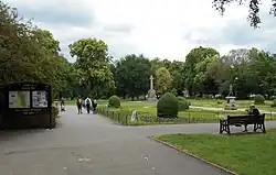 Within the park is a memorial to soldiers killed in the Boer War (1899–1902) which consists of a bronze statue of a soldier on a granite plinth. This was first created in 1905, and was originally located in Bond Gate in the town centre, but was moved to the park in 1967. In 2006 the original statue was stolen, and it was replaced by an identical one in 2008. The memorial is grade II listed.[5]