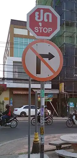 Road signs in Laos generally both follow those used in China and most European countries as set out in the Vienna Convention on Road Signs and Signals. Despite this, the country itself has never signed the Vienna Convention on Road Signs and Signals. Inscriptions on traffic signs are in Lao, the national language of Laos. However, English is also used for stop and important public places such as tourist attractions, airports, railway stations, and immigration checkpoints. Both Lao and English are used on directional signage.