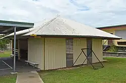In 1899 the playshed was built. The Queensland education system recognised the importance of play in the school curriculum and, as school sites were typically cleared of all vegetation, the provision of all-weather outdoor space was needed. Playsheds were designed as free-standing shelters, with fixed timber seating between posts and earth or decomposed granite floors that provided covered play space and doubled as teaching space when required. These structures were timber-framed and generally open sided, although some were partially enclosed with timber boards or corrugated galvanised iron sheets.[30] The hipped (or less frequently, gabled) roofs were clad with timber shingles or corrugated iron. Playsheds were a typical addition to state schools across Queensland between c. 1880s and the 1950s, although less frequently constructed after c. 1909, with the introduction of highset school buildings with understorey play areas. Built to standard designs, playsheds ranged in size relative to student numbers.[31] In 1948 the Roadvale State School playshed was partially enclosed with iron sheeting which had come from the recently closed Obum Obum State School's playshed, and in 1956 the playshed floor was concreted.[23][32][1]