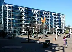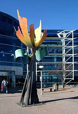 The terminal was designed by the Charlotte-based architectural firm Odell Associates and was built to replace the 1953 terminal, which was demolished in 2005.[31] Construction of the terminal commenced in 1987,[13] and it opened in October 1989 at a final cost of $25 million.[8] The Y-shaped building features a front of blue-tinted, reflecting glass with exposed white triangular tube steel trusses.[8] The lobby interior includes an arched brick wall leading into a central plaza and a front courtyard at the main entrance. The terminal was constructed to handle passengers expected through the year 2010, with a design that allows for expansion when warranted.[8] Outside the terminal is an abstract, steel sculpture by New York artist Albert Paley entitled Aurora. Installed in October 1990, the sculpture is 21 feet (6.4 m) feet tall.[32]
