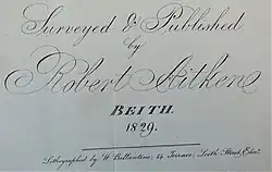 Robert Aitken was a Land Surveyor and a Cartographer who was born in Ayrshire circa 1786. In 1829 he surveyed and published "A new Parish Atlas of Ayrshire, Part 1, Cuninghame District"[1] in Beith, North Ayrshire.